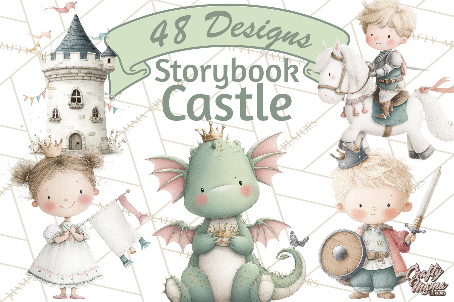 Bring magical fairy tale charm to your projects with this kids medieval fantasy clipart collection featuring adorable dragons, princes, princesses, knights, and castles in a whimsical storybook style.