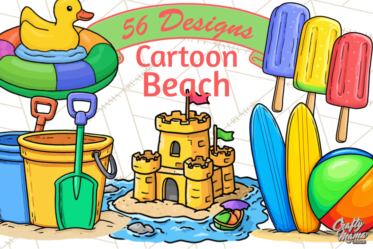 This playful illustrated summer theme features a wide variety of beach toys, pool floats, sand accessories, tropical elements, and sunny seasonal icons.