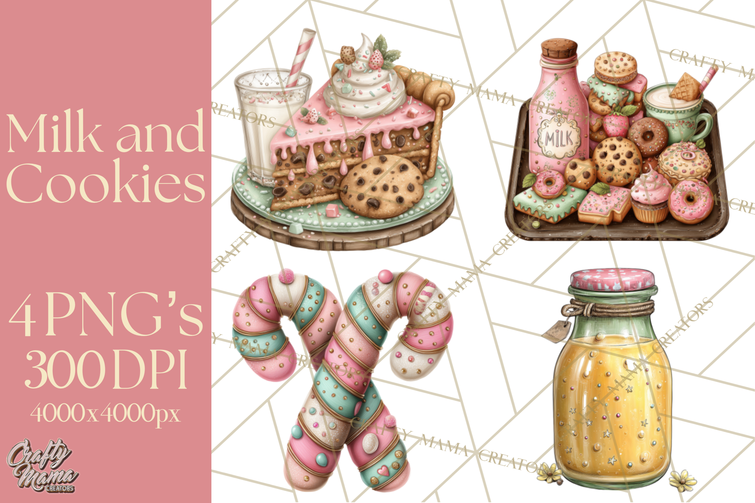 Create sweet dessert themed designs with this milk, cookies, candy, and chocolate clipart. These vibrant bakery inspired graphics feature classic cookies, flavored milk drinks, chocolates, candies, and delicious dessert treats illustrated with rich textures and highlights.
