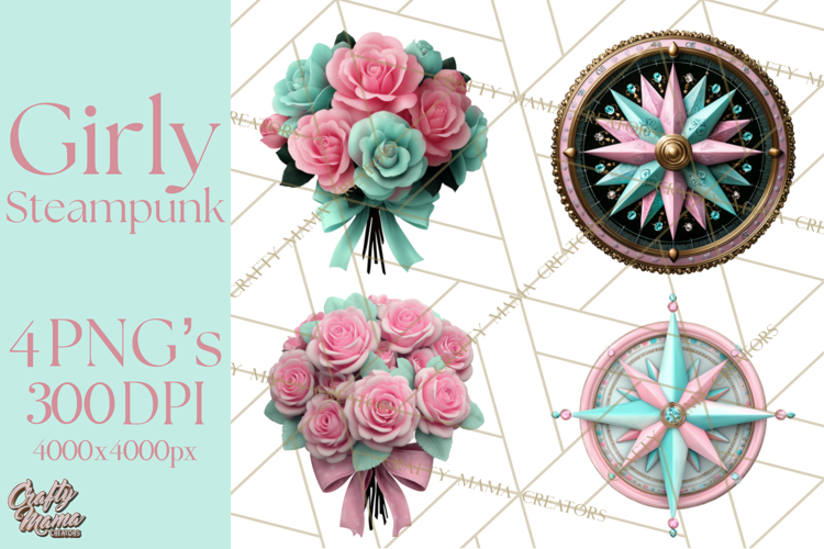 This elegant girly steampunk clipart features beautiful Victorian-inspired illustrations with intricate clockwork, brass gears, and feminine design elements. Soft pink tones and whimsical mechanical details create a romantic steampunk aesthetic perfect for creative projects.