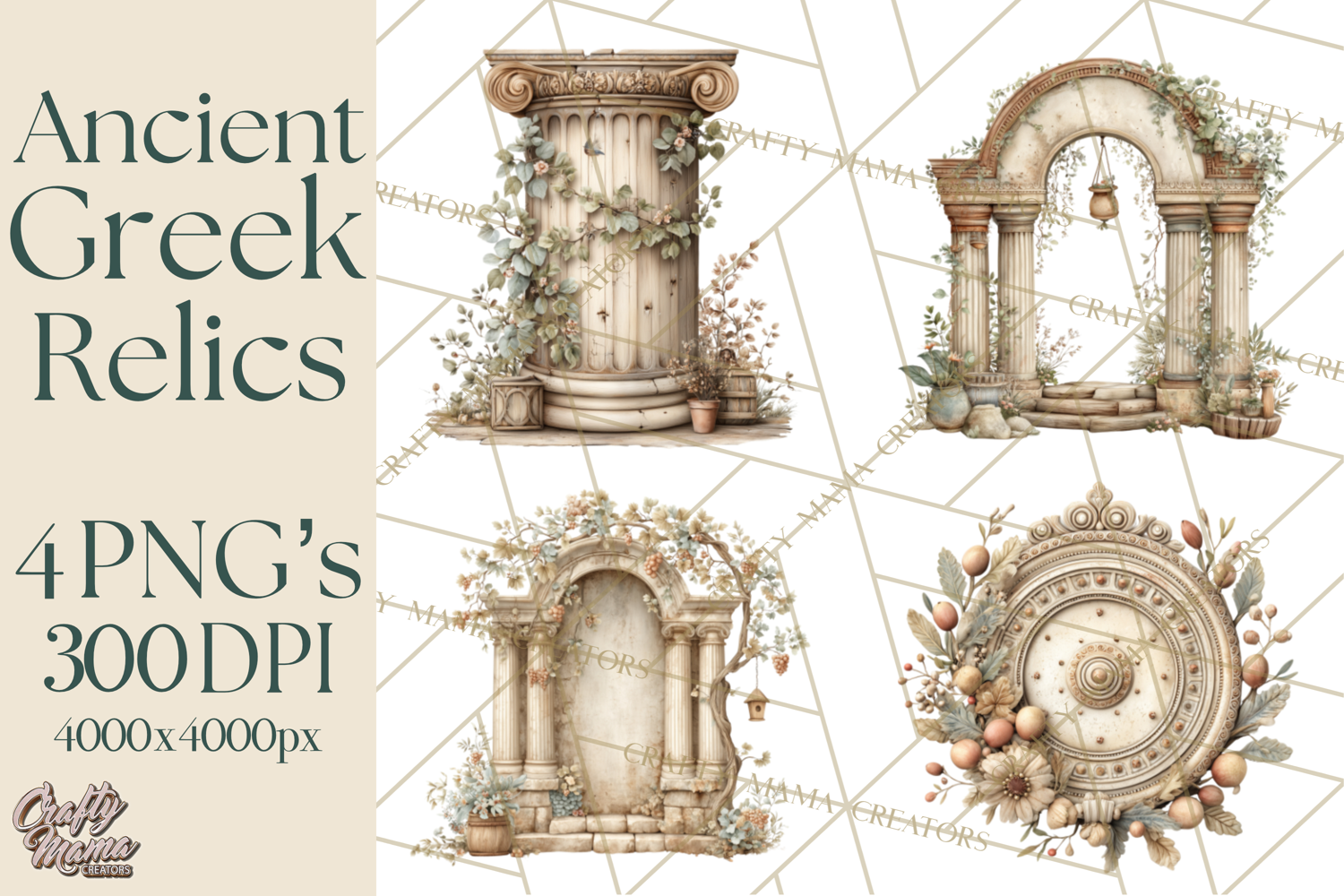 Bring the elegance of Ancient Greece into your designs with this beautiful classical clipart. Featuring 68 detailed illustrations inspired by Greek art, architecture, and decorative elements, this set captures a timeless Mediterranean aesthetic with soft neutral tones and aged textures.
