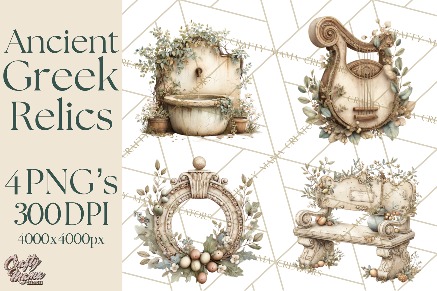 Bring the elegance of Ancient Greece into your designs with this beautiful classical clipart. Featuring 68 detailed illustrations inspired by Greek art, architecture, and decorative elements, this set captures a timeless Mediterranean aesthetic with soft neutral tones and aged textures.