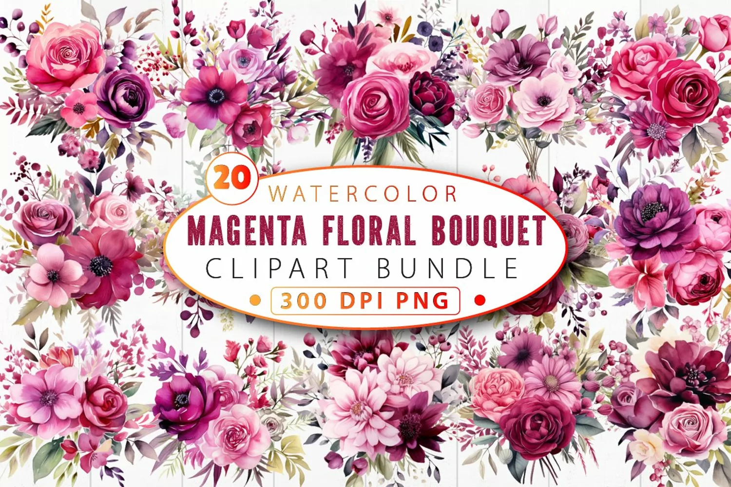 Watercolor Magenta Floral Bouquet Clipart Bundle
