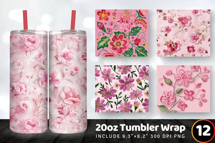 Pink Embroidery Flowers Tumbler Wrap, 20oz Skinny Tumbler Wraps
