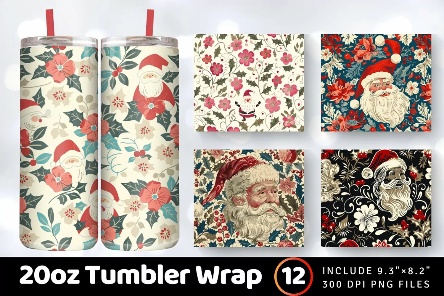 Retro Santa Floral Christmas Tumbler Wrap, 20oz Skinny Tumbler Wraps