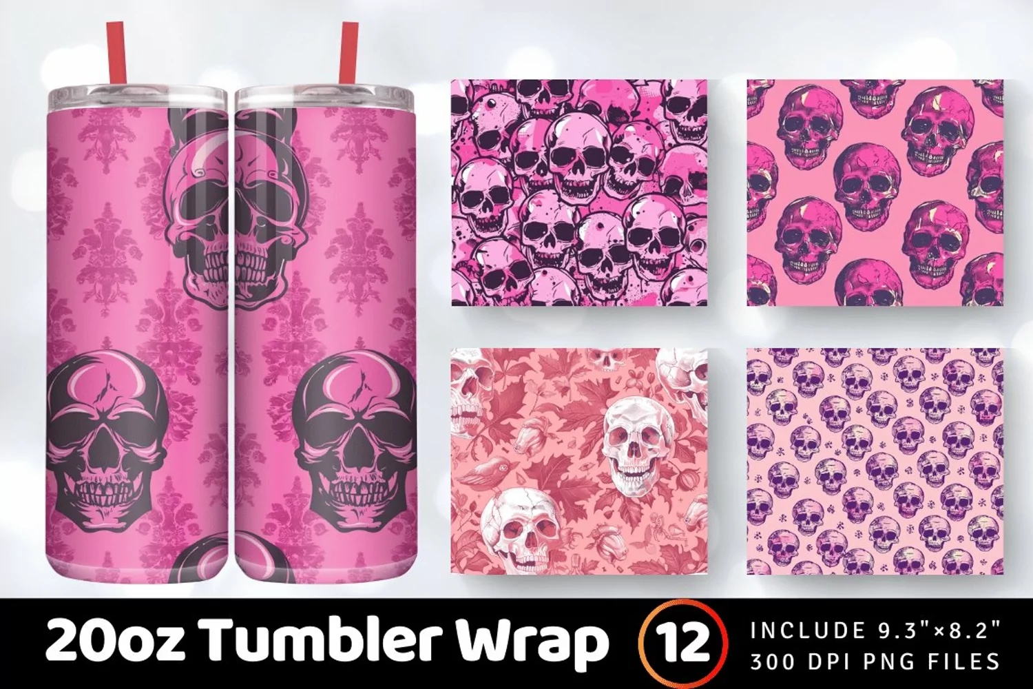 Pink Halloween with Skulls Tumbler Wrap, 20oz Skinny Tumbler Wraps
