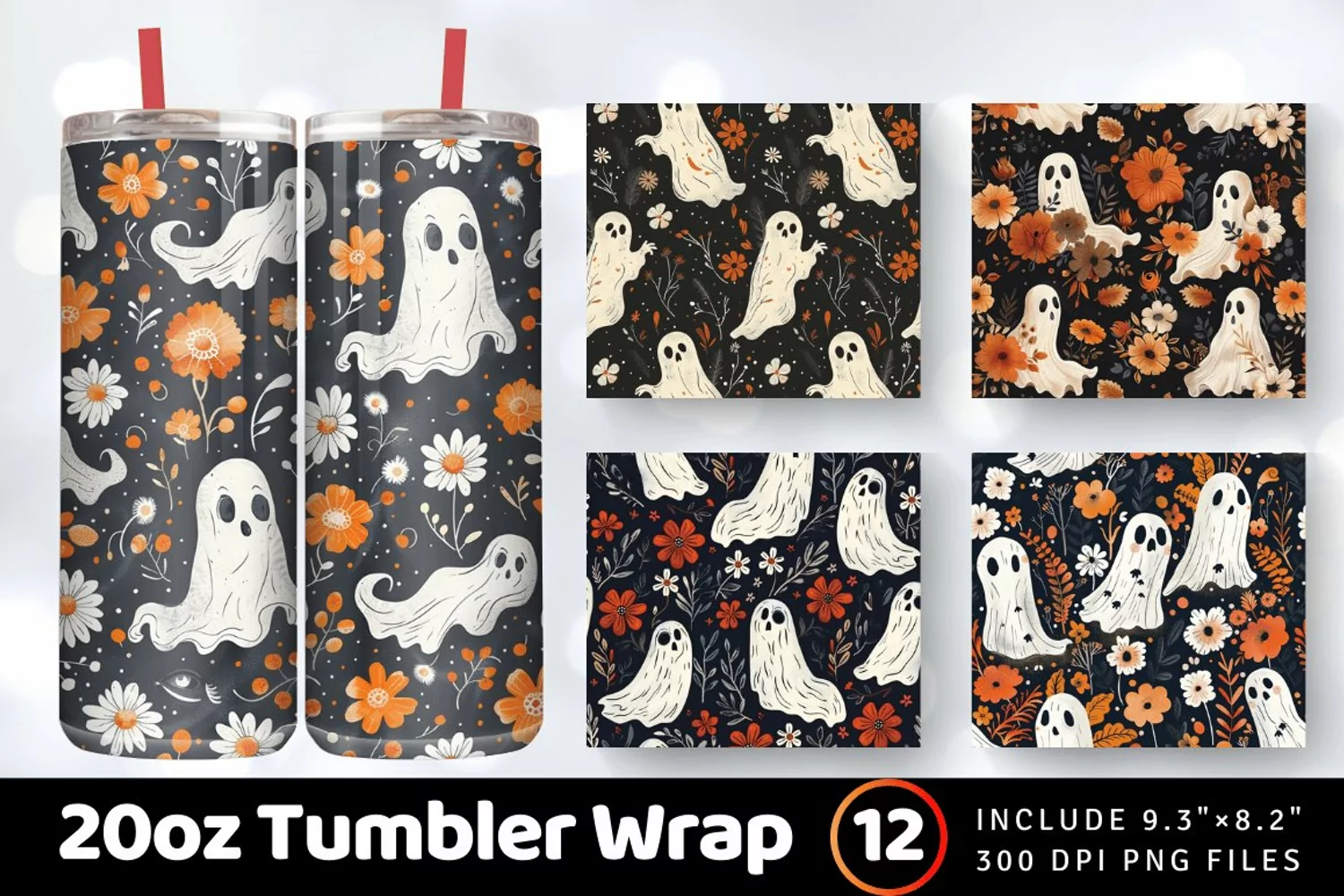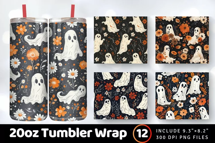 Boho Floral Ghost Halloween Tumbler Wrap, 20oz Skinny Tumbler Wraps