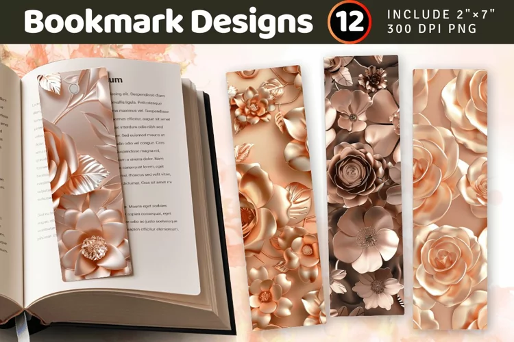 Rose Gold 3D Flowers PNG Bookmark Sublimation Designs