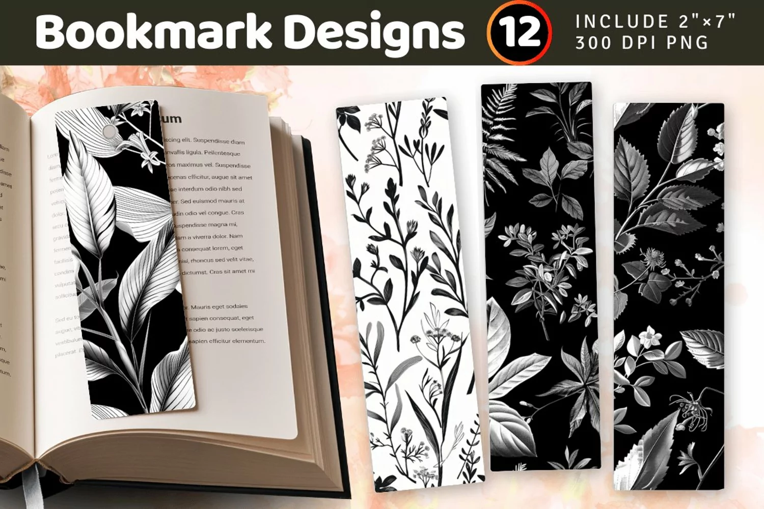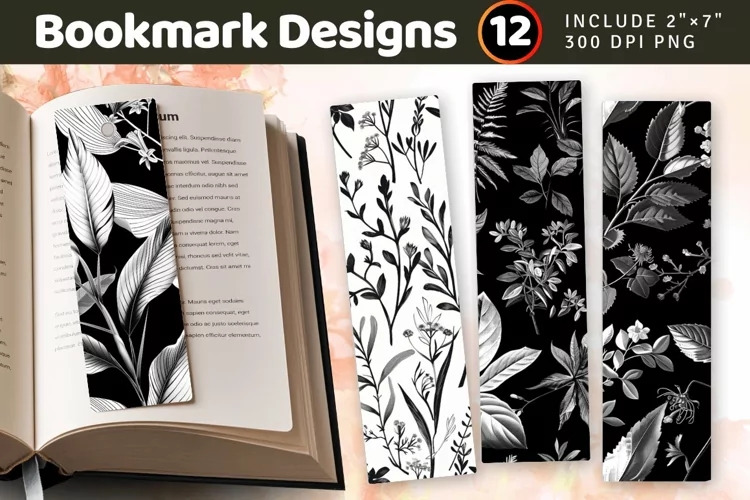 Black & White Botanical PNG Bookmark Sublimation Designs