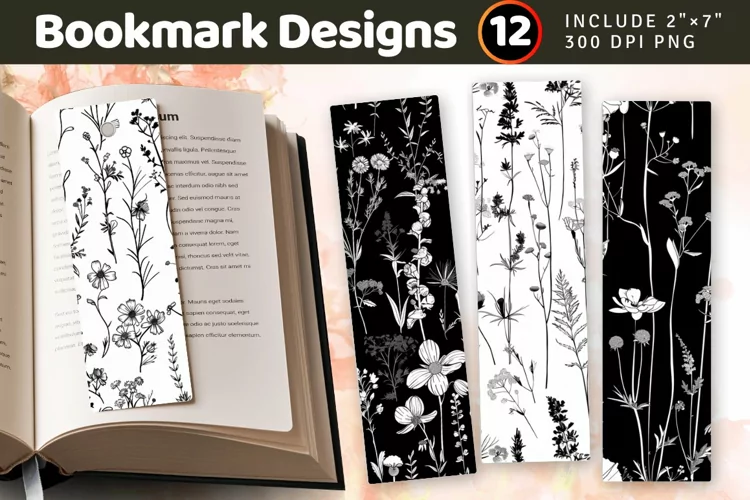 Wildflowers Black White PNG Bookmark Sublimation Designs
