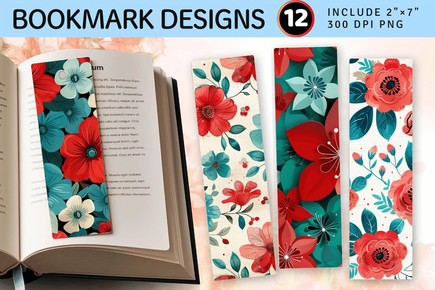 Red & Teal Flowers PNG Bookmark Sublimation Designs