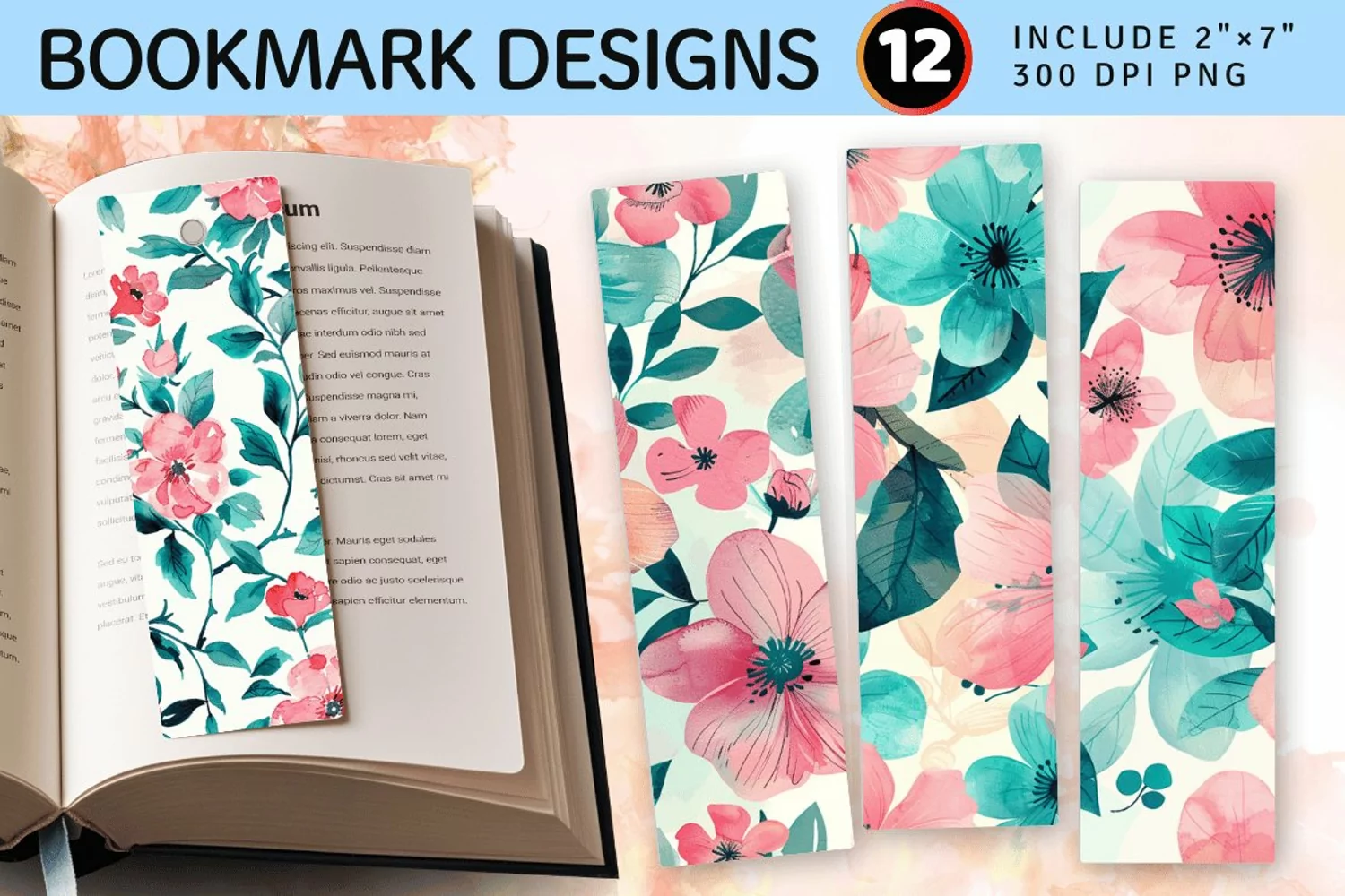 Pink & Teal Watercolor Flowers PNG Bookmark Sublimation Designs