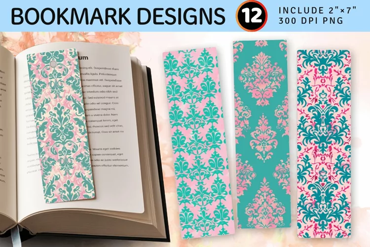 Pink & Teal Damask PNG Bookmark Sublimation Designs