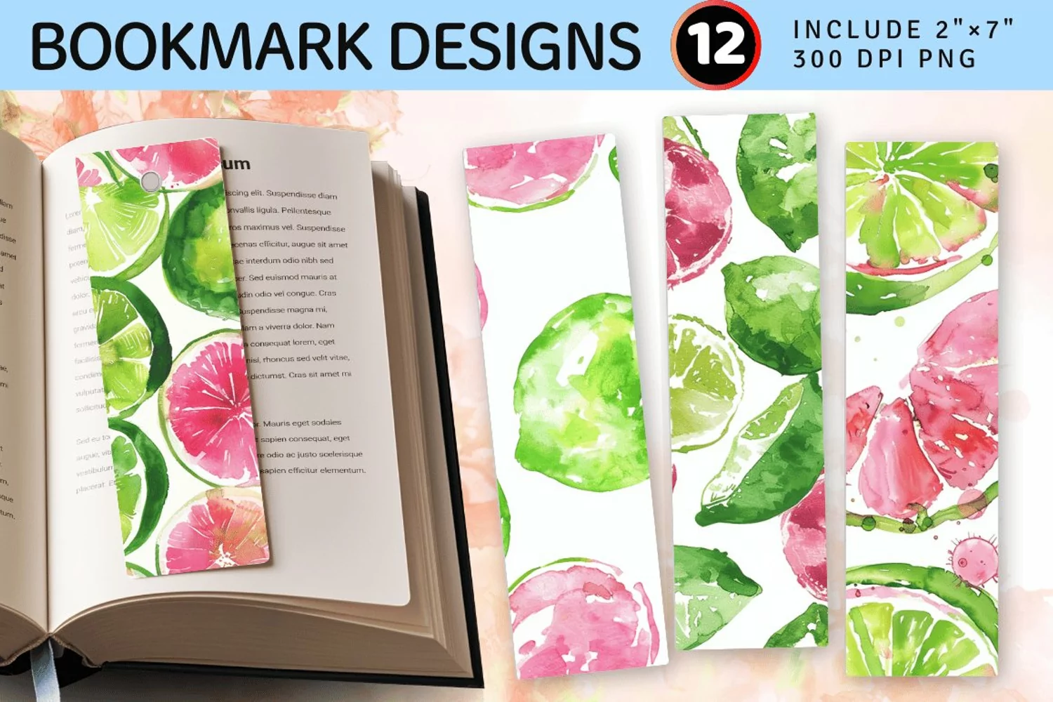 Pink & Green Watercolor Limes PNG Bookmark Sublimation Designs