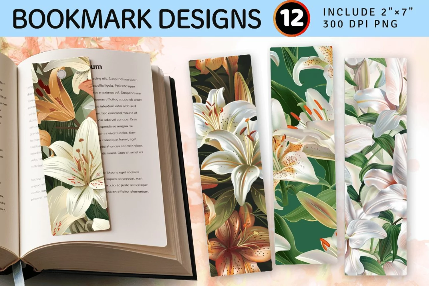 Elegant Lilies Flowers PNG Bookmark Sublimation Designs