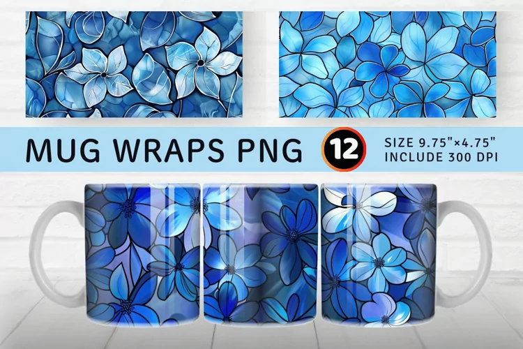Blue Stained Glass Floral Mug wrap Sublimation Designs
