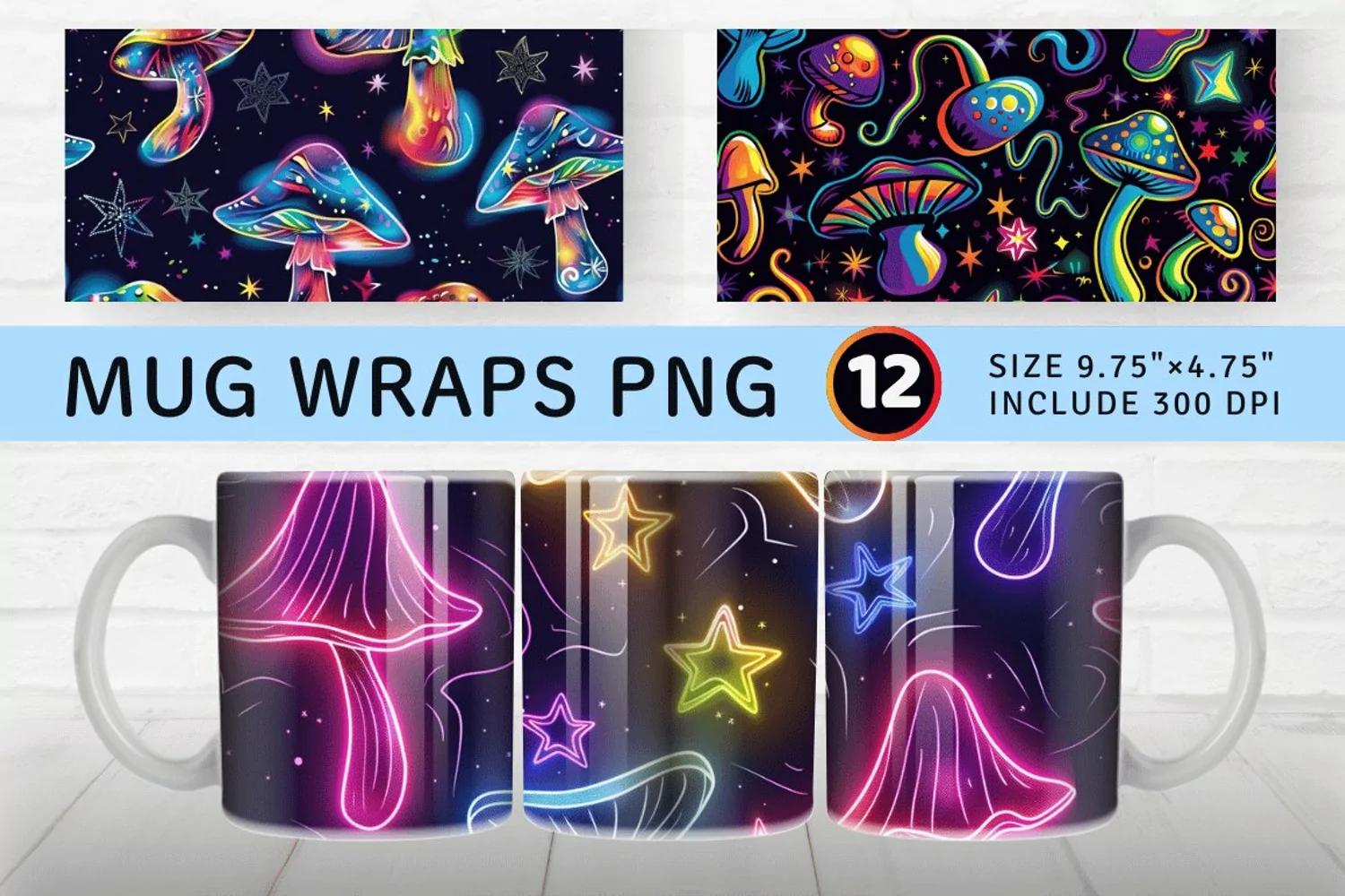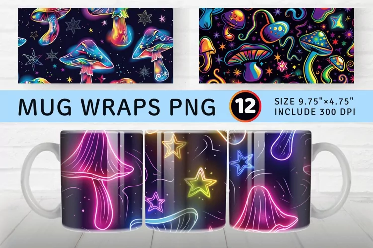 Neon Funky Fantasy Mushroom Star Mug wrap Sublimation Designs