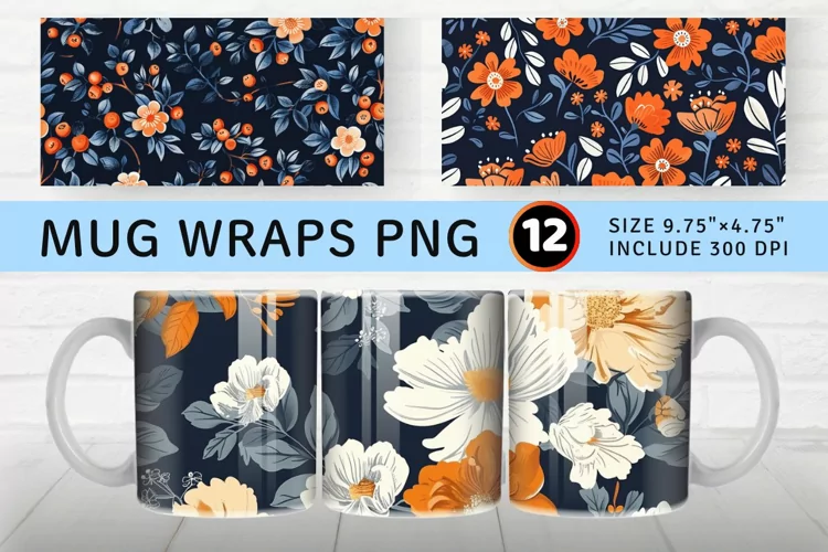 Navy & Tangerine Floral Mug wrap Sublimation Designs