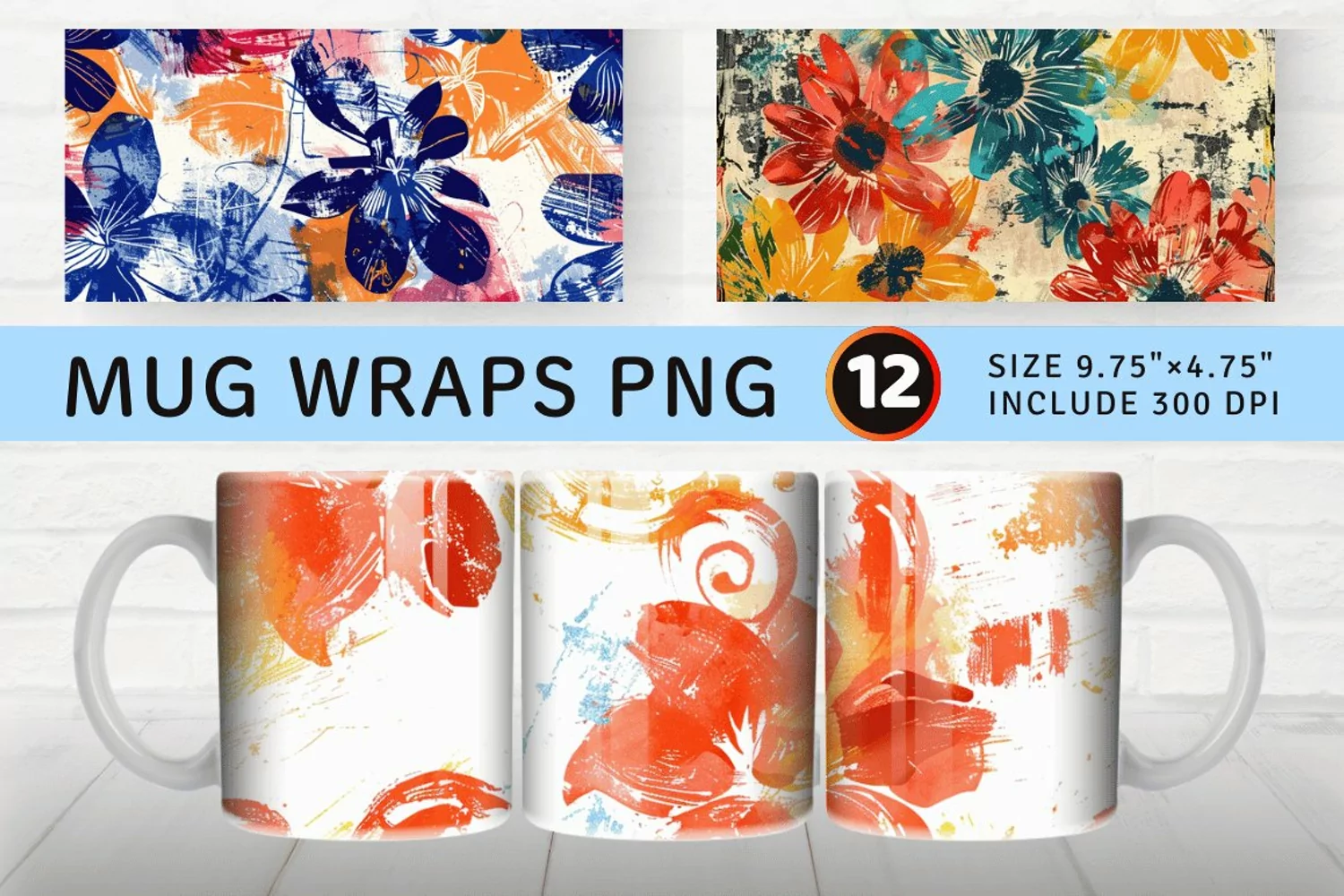 Grunge Painted Floral Mug wrap Sublimation Designs