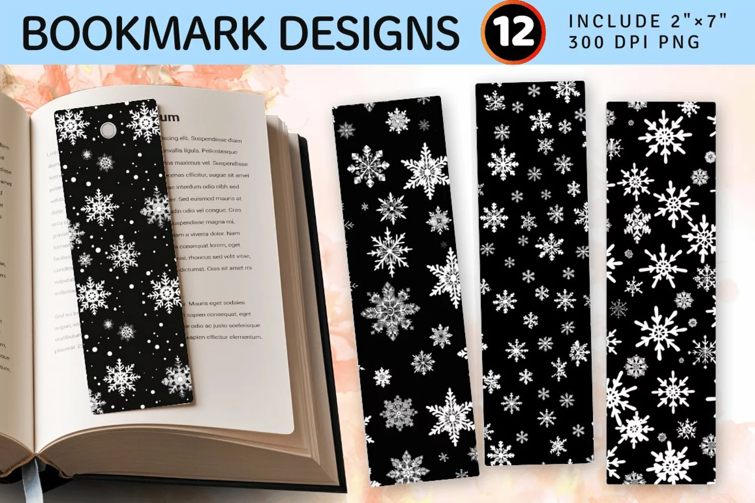 Black & White Snowflakes PNG Bookmark Sublimation Designs