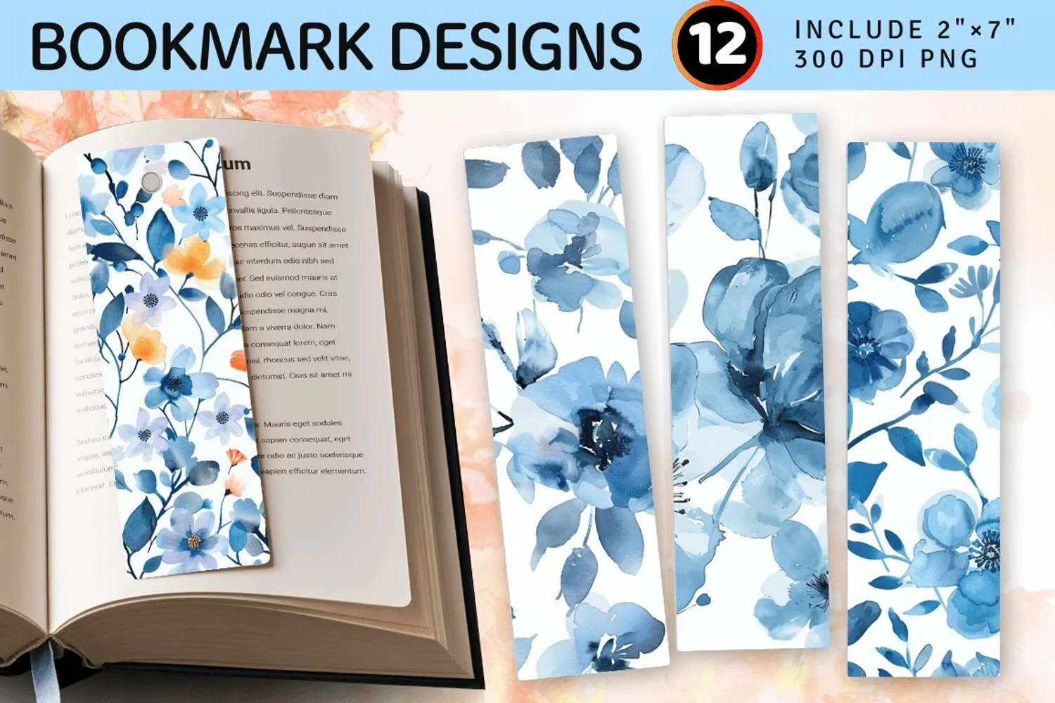Pastel Blue Watercolor Floral PNG Bookmark Sublimation Designs