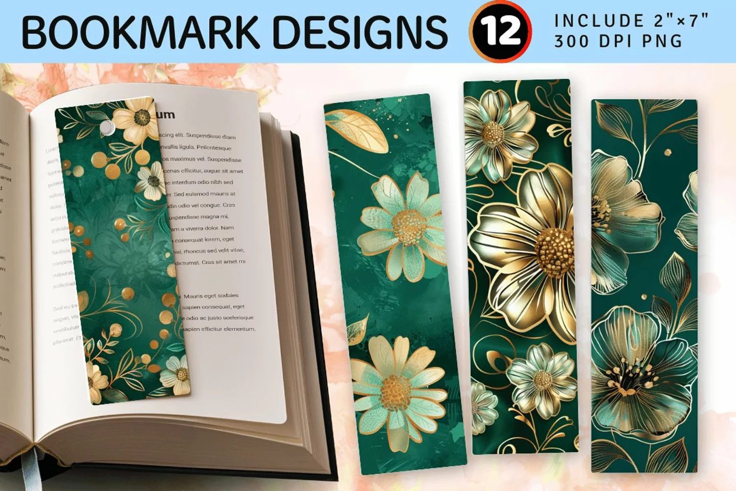 Emerald Gold Flowers PNG Bookmark Sublimation Designs