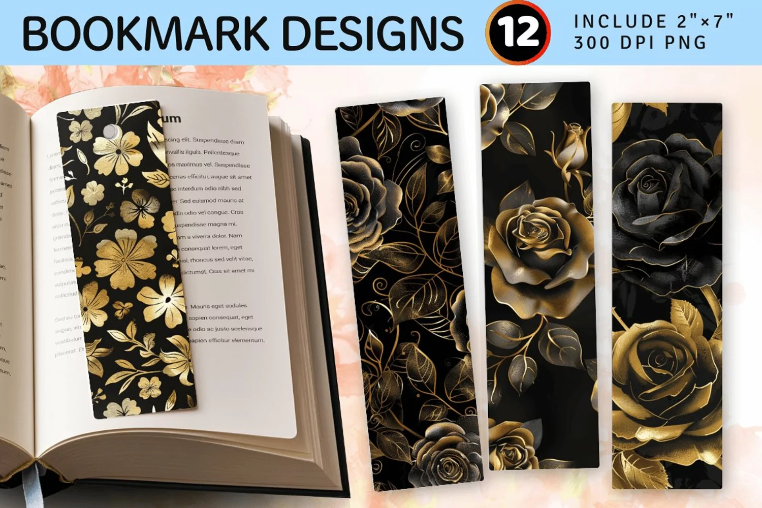 Black and Gold Roses PNG Bookmark Sublimation Designs