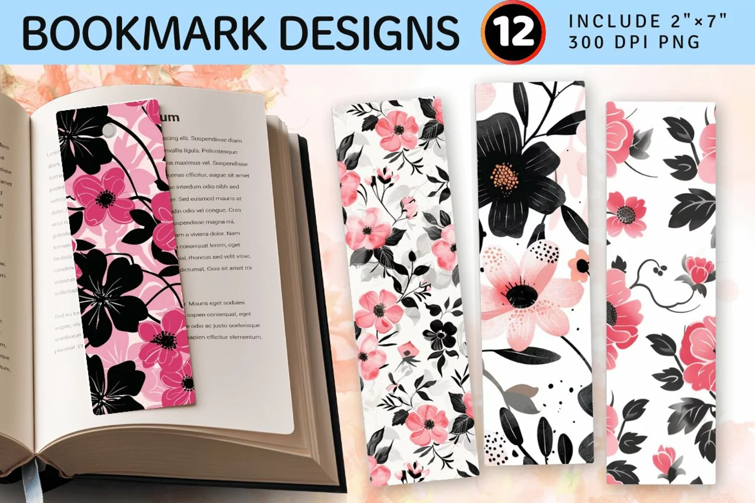 Pink & Black Flowers PNG Bookmark Sublimation Designs
