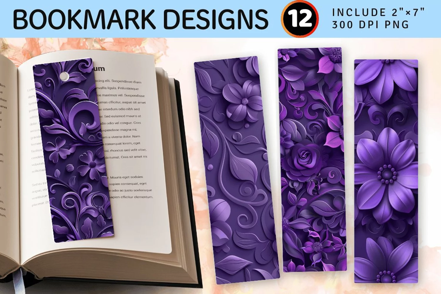 3D Violet Floral PNG Bookmark Sublimation Designs