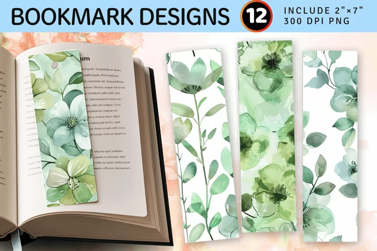 Watercolor Green Pastel Flowers PNG Bookmark Sublimation Designs