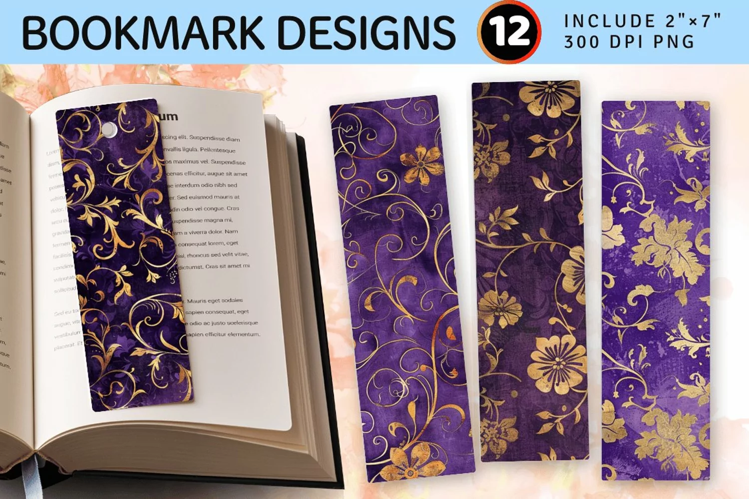 Purple and Gold Luxury Floral PNG Bookmark Sublimation Designs