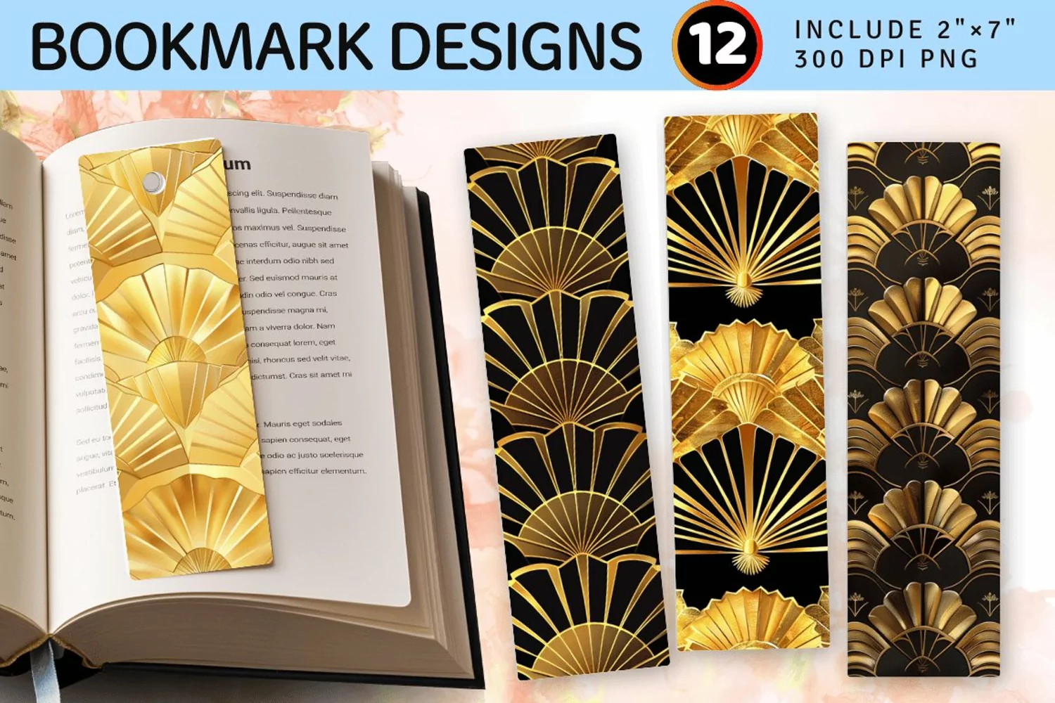 Golden Fan Motifs PNG Bookmark Sublimation Designs
