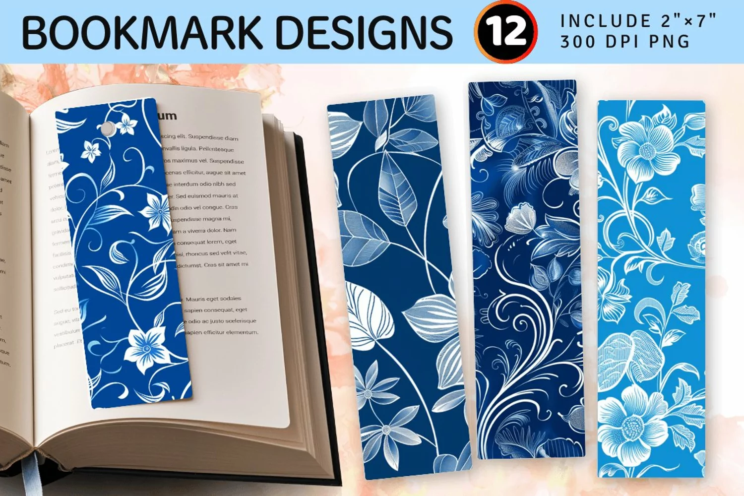White Line on Blue Floral PNG Bookmark Sublimation Designs