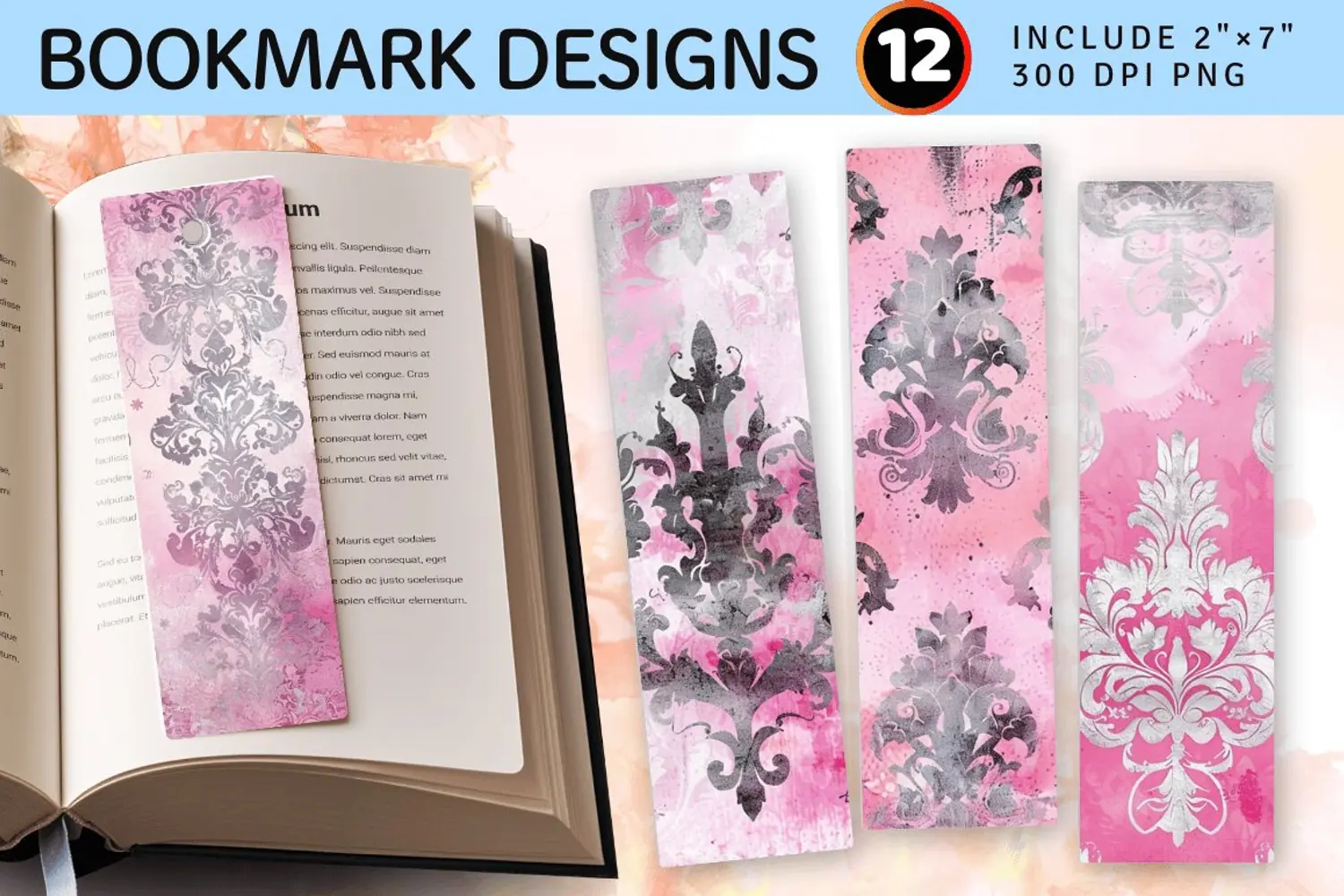 Pink and Silver Damask PNG Bookmark Sublimation Designs