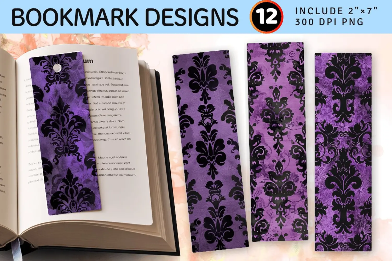 Purple and Black Damask PNG Bookmark Sublimation Designs