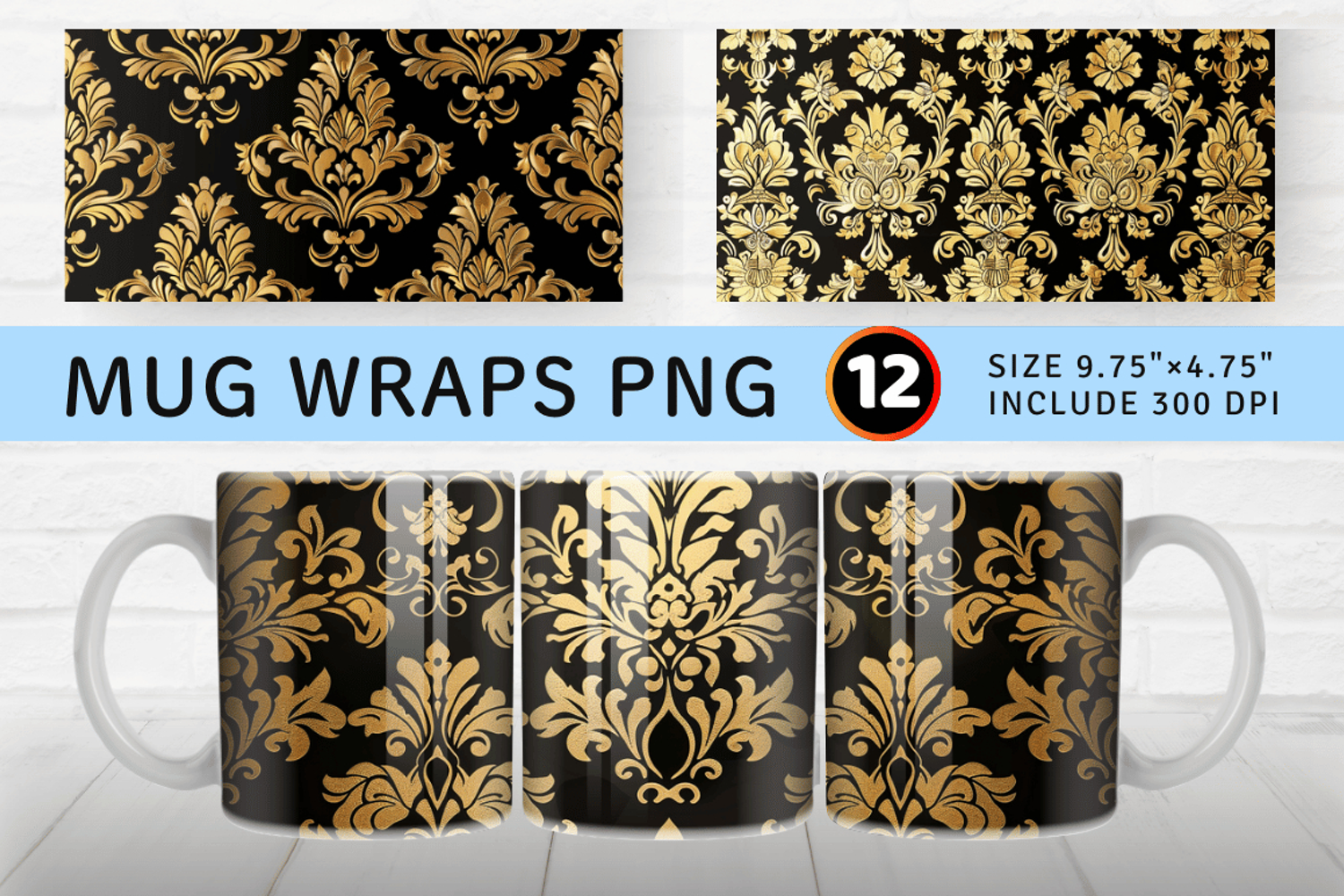 Luxury Golden Damask Fabric Mug Wrap Sublimation Designs