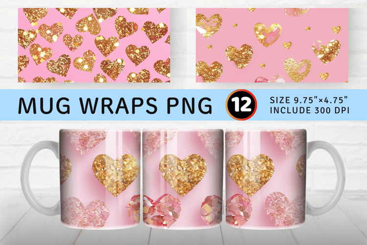 Cute Valentine Pink Gold Glitters Heart Mug Wrap Sublimation Designs