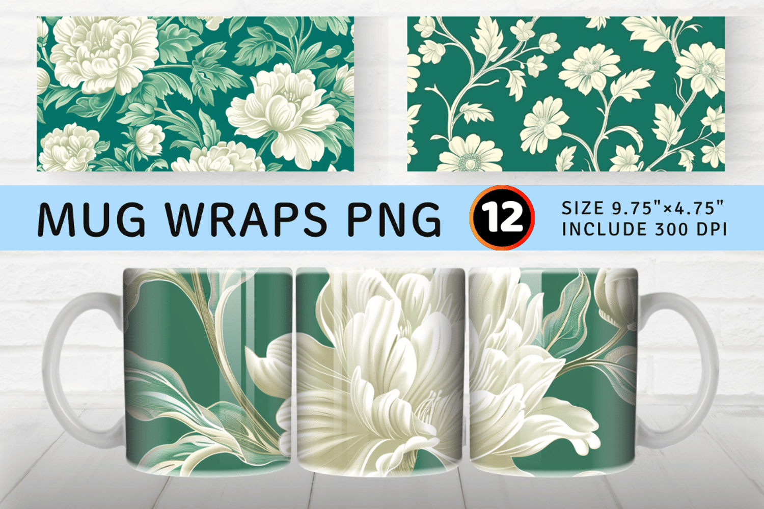 Ivory Floral on Emerald Mug Wrap Sublimation Designs