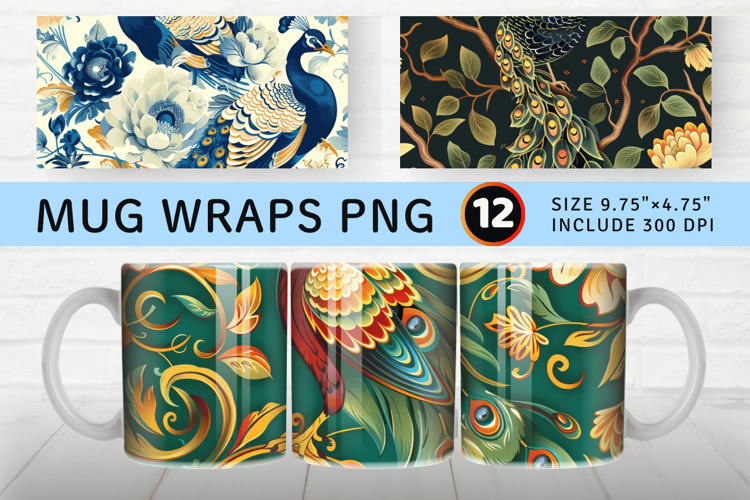Floral Peacock Mug Wrap Sublimation Designs