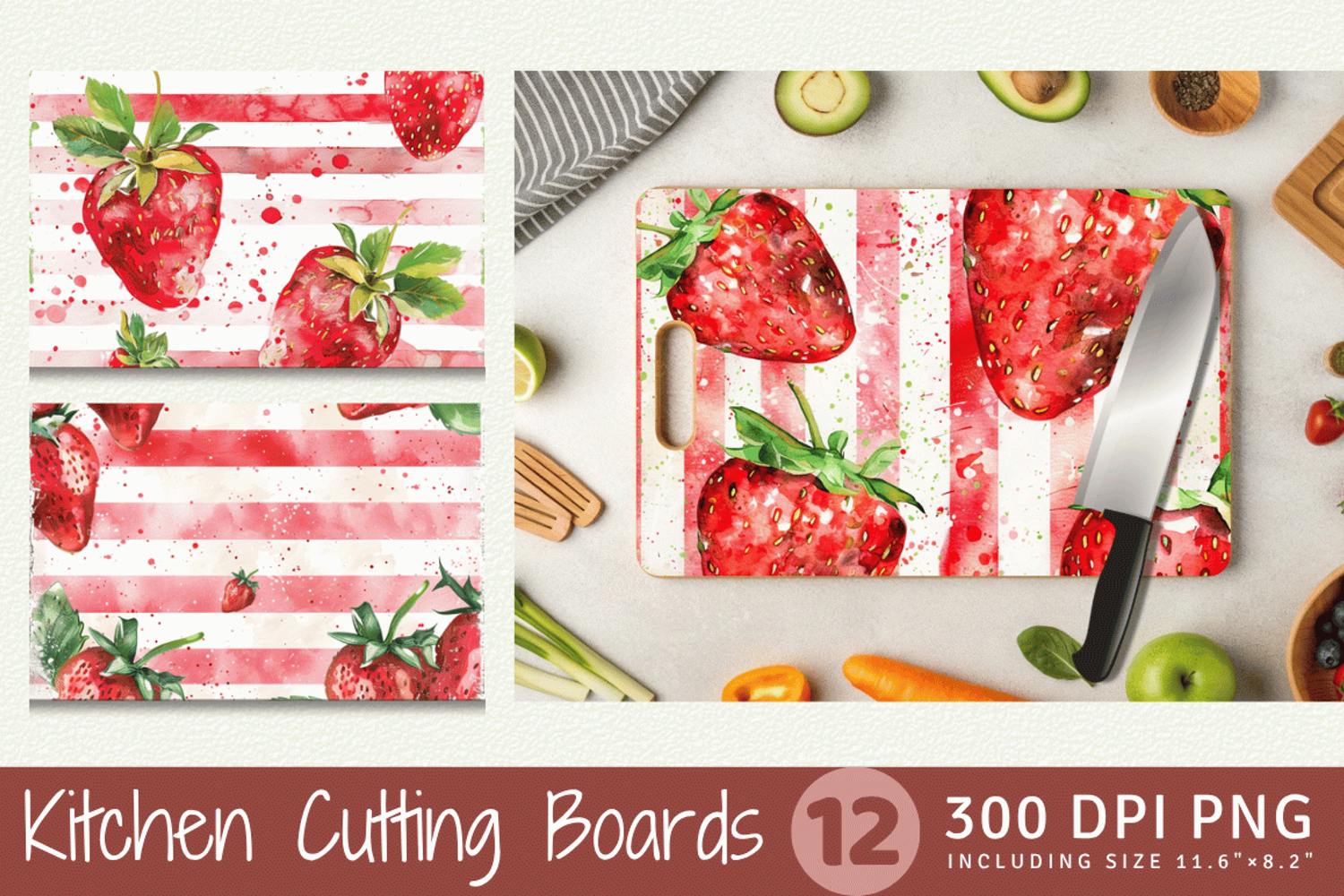 Watercolor Strawberries & Stripes Cutting Boards sublimation Designs