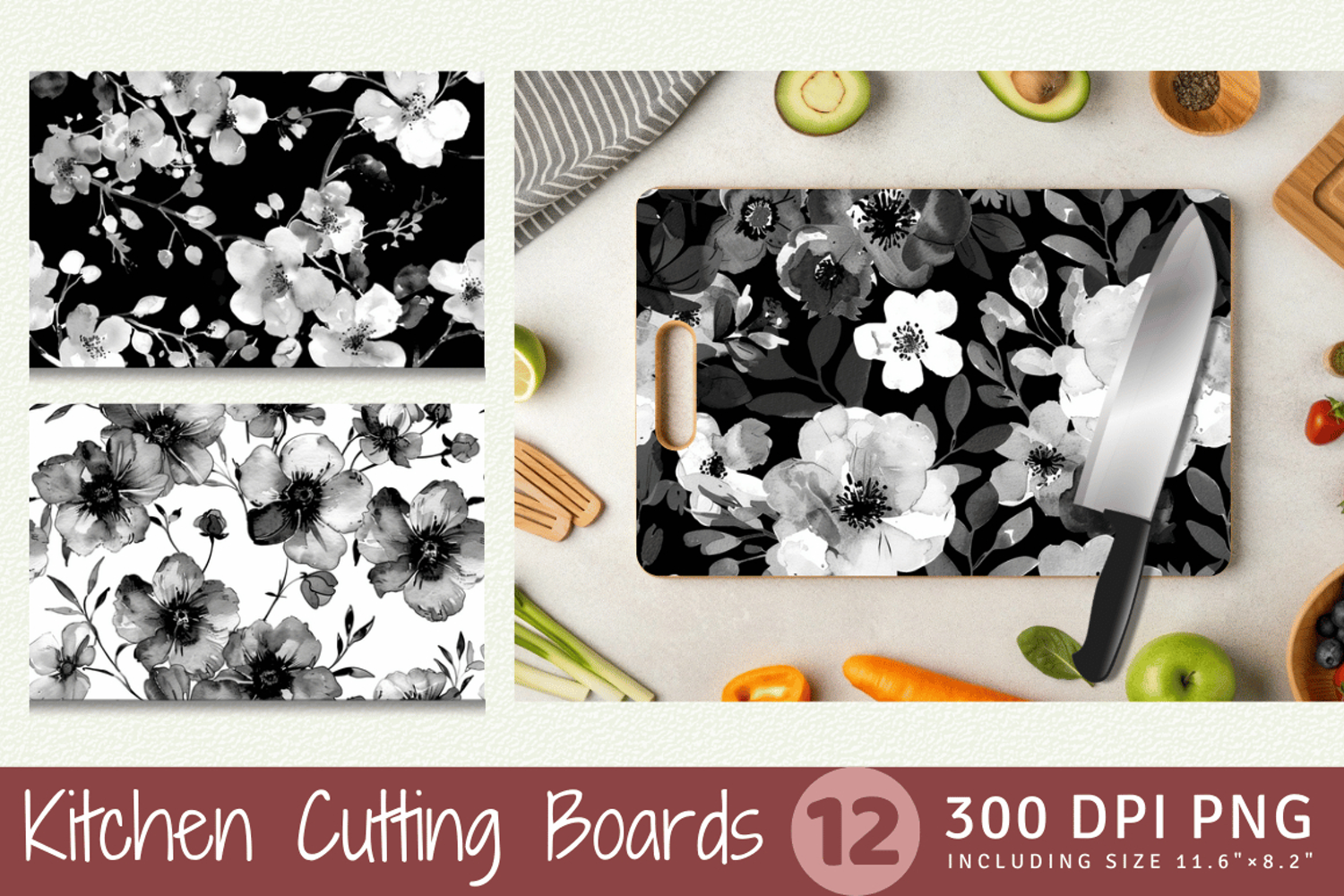 Black & White Watercolor Flowers Cutting Boards sublimation Designs