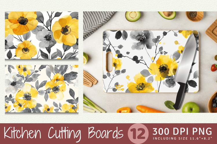 Grey & Yellow Watercolor Flowers Cutting Boards sublimation Designs