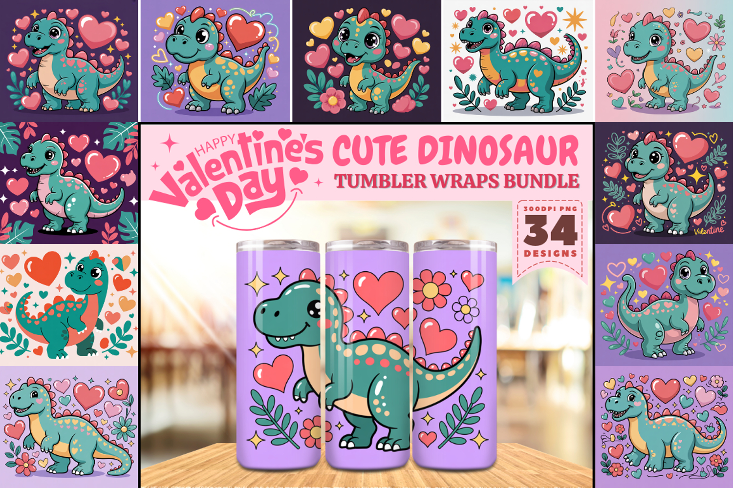 Valentine’s Cute Dinosaur Tumbler Wrap PNG Bundle | 20oz Skinny Tumbler Wrap PNG Sublimation Design Bundle!