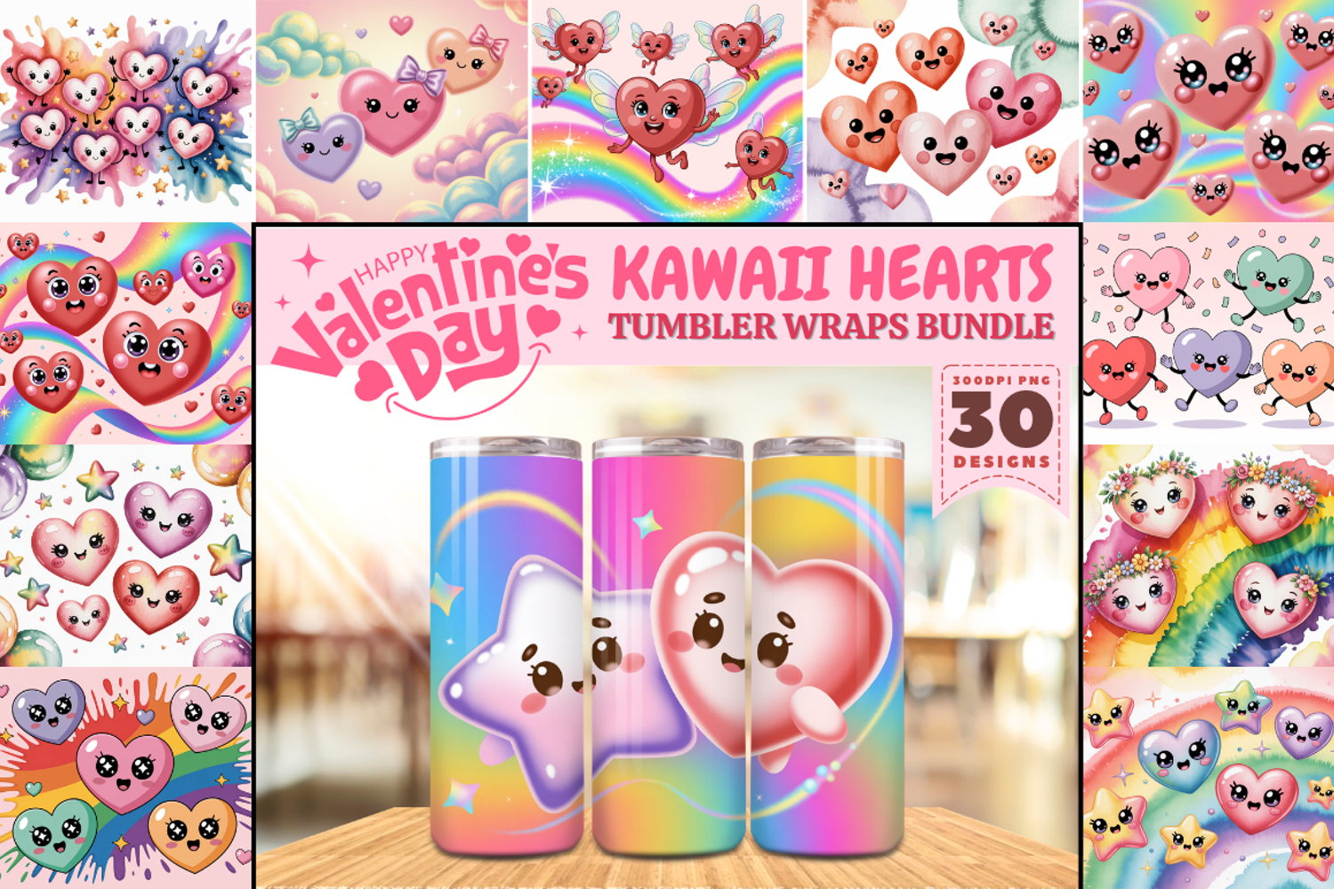 Valentine’s Day Kawaii Hearts Tumbler Wrap PNG Bundle | 20oz Skinny Tumbler Wrap PNG Sublimation Design Bundle!