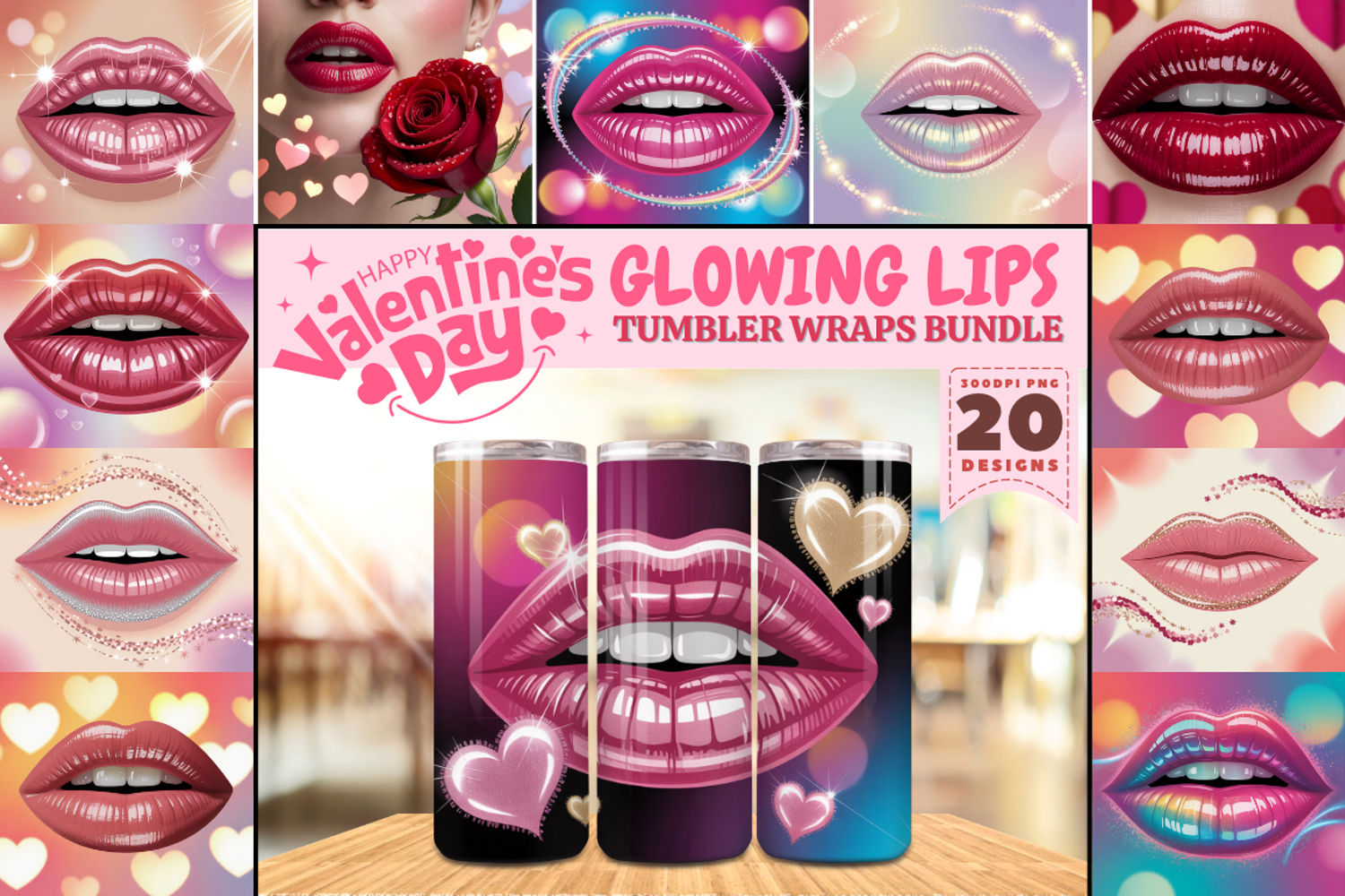 Valentine’s Day Glowing lips Tumbler Wrap PNG Bundle | 20oz Skinny Tumbler Wrap PNG Sublimation Design Bundle!