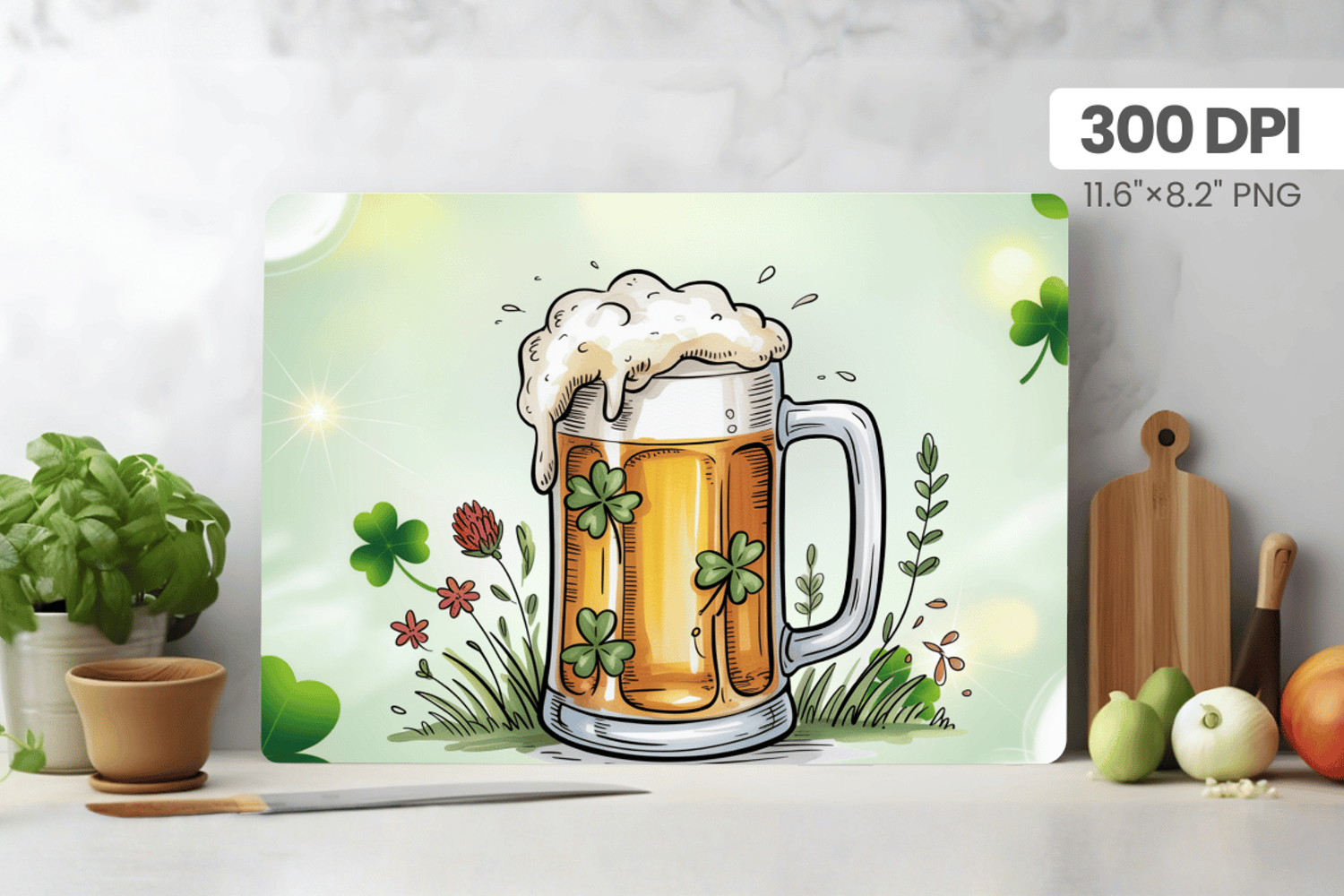 Irish Beer Mug with Clover Cutting Board PNG Sublimation Des example image 1