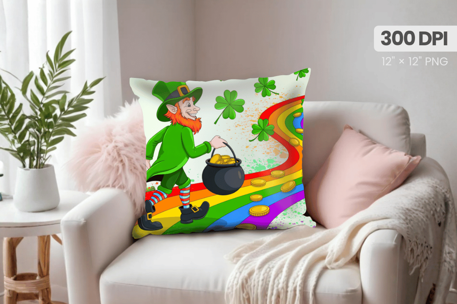 Leprechaun on Rainbow Road with Gold Pillow PNG Sublimation
