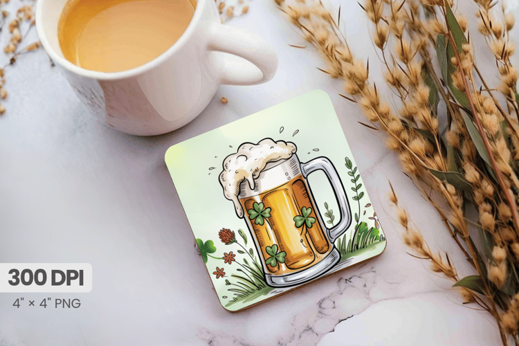 Irish Beer Mug with Clover Square Coaster PNG Sublimation De example image 1