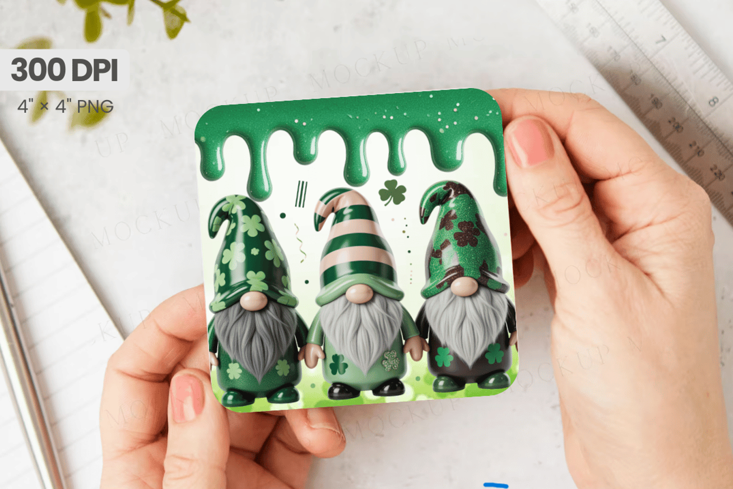 Cute St Patrick’s Day Gnomes with Shamrocks Square Coaster P example image 1