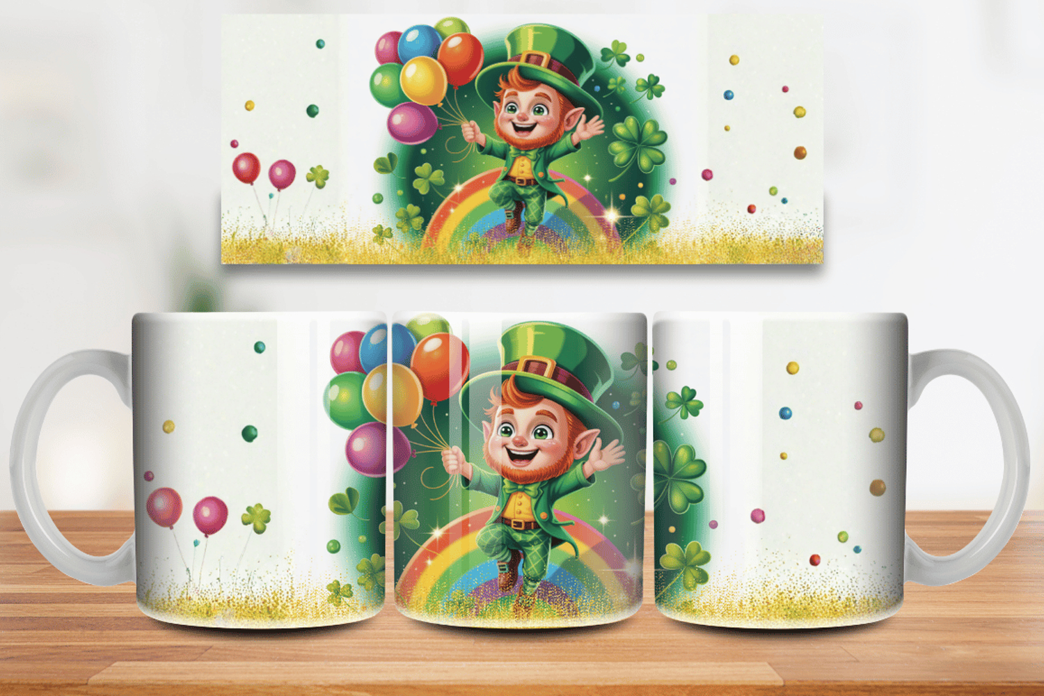 Cute Leprechaun with Rainbow and Balloons Mug Wrap PNG Subli